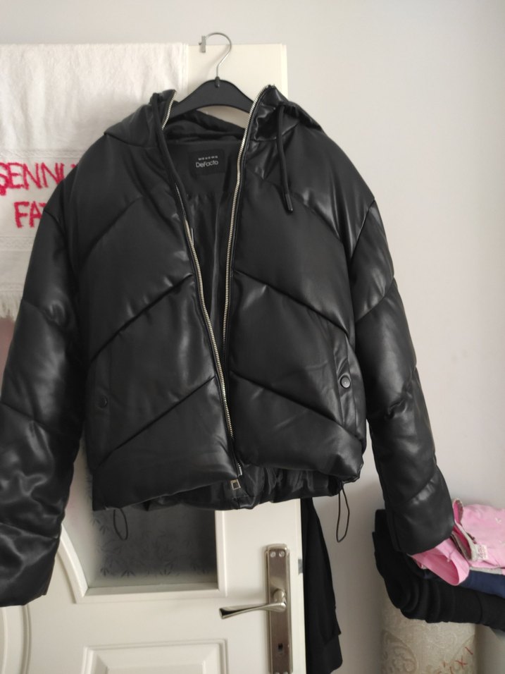 Kemerli, kısa kesim siyah deri kadın mont. Yüksek yakalı ve askılı kollu, sokak stiline uygun şık bir parça.