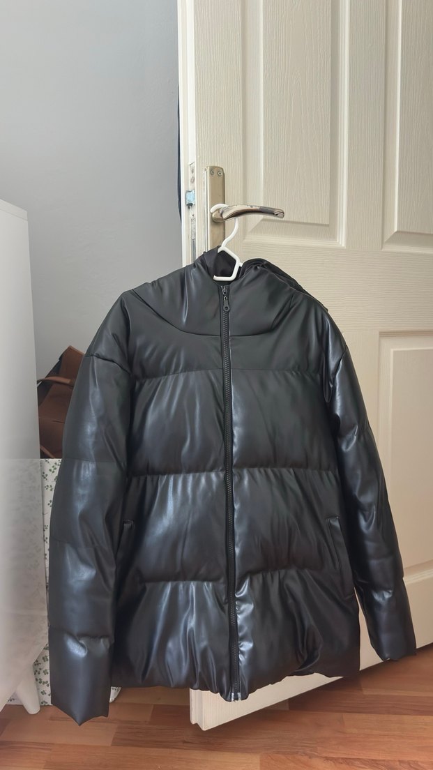 Kemer detaylı, yüksek yakalı ve normal boyda siyah deri kadın kışlık mont, genç ve rahat stil için uygun.