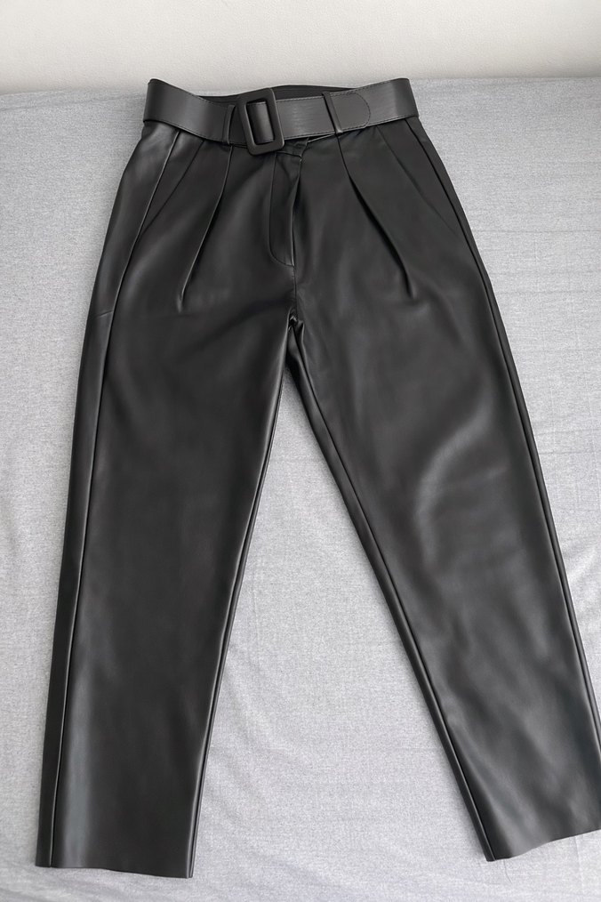 Kemerli bel, regular fit ve midi boy özellikli siyah deri kadın pantolon. Minimalist tarzda, zamansız kombinlerinize şıklık katacak.