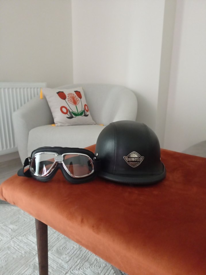 Kemer detaylı siyah deri klasik motosiklet kaskı, desen içermeyen yüzeye sahip. Vintage tarzı gözlükle birlikte gelir. ️