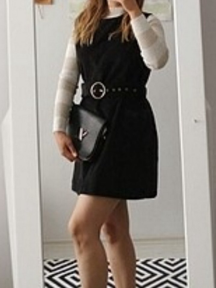 Kemer detaylı, yüksek yakalı, askılı siyah deri midi elbise, vücuda oturan kesime sahiptir.