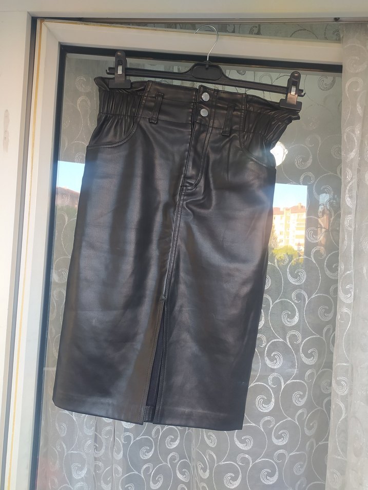 Kemerli bel, fitted kesim ve ön yırtmaçlı siyah deri midi etek, sokak modasına uygun.