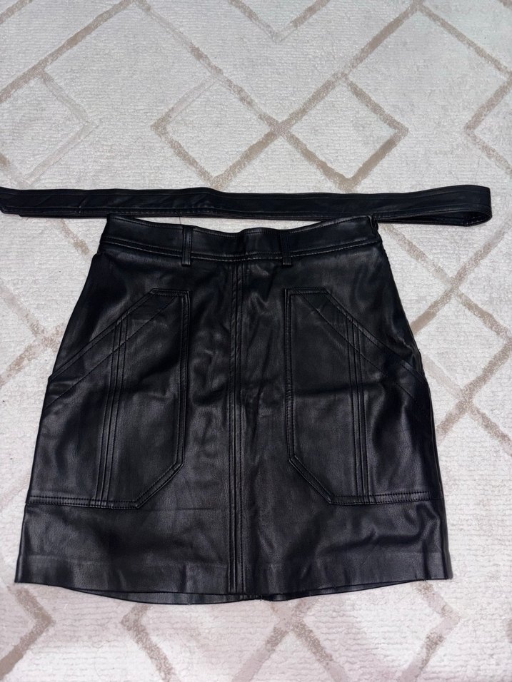 Kemerli, fitted kesim siyah deri mini etek, gotik ve avant-garde Paris tarzını yansıtır. Günlük kullanım için uygundur.