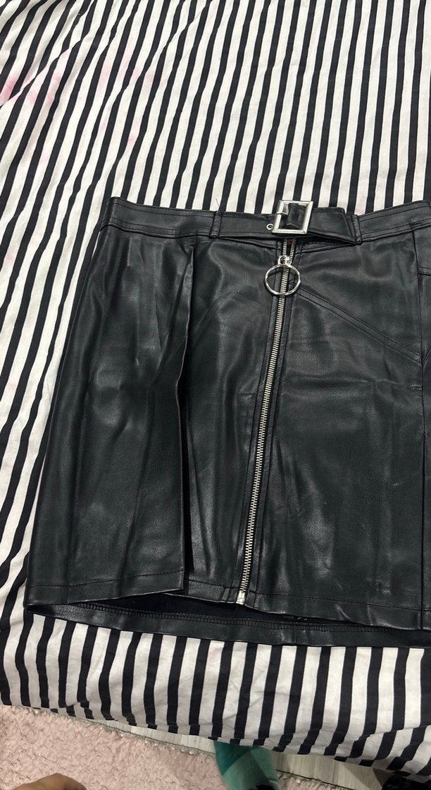 Önü fermuarlı ve kemerli, siyah deri mini etek. Sıkı kesimi ve gotik tarzıyla günlük kullanıma uygundur.