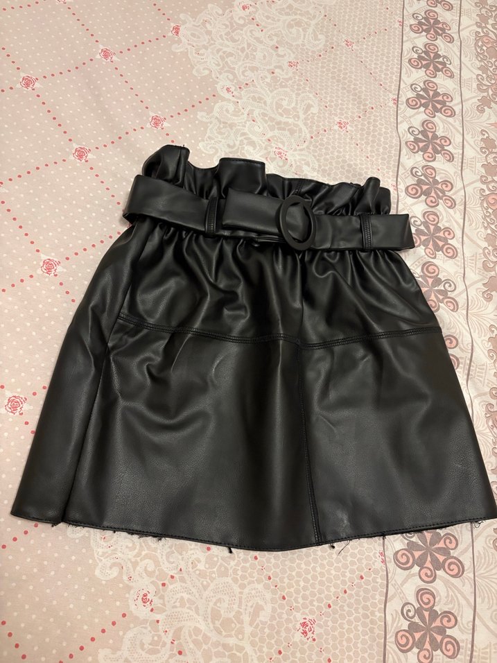 Kemerli bel kısmı ve bol kesimiyle siyah deri mini etek, gotik tarzı yansıtarak romantik akşamlar için uygun. Desensiz, avant-garde bir görünüm sunar.