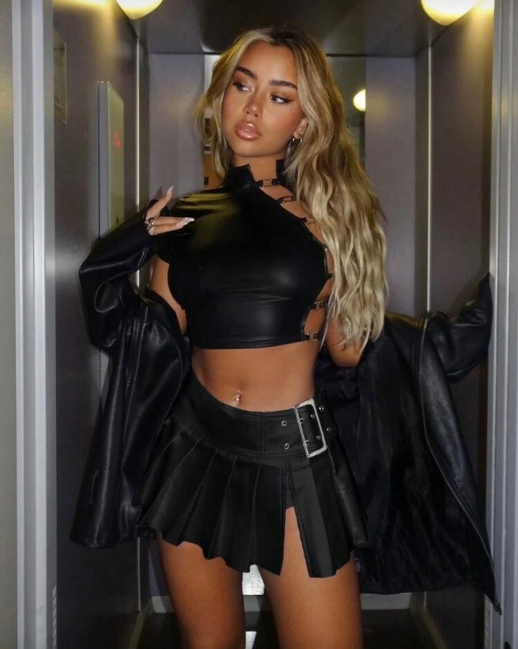Kemerli, siyah deri mini etek, dar kesimi ve kısa boyuyla gotik parti stiline uygundur. Düz ve şık tasarıma sahiptir.