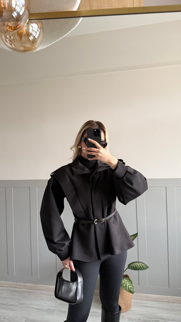 Bu siyah deri mini ceket, kemerli bel ve yüksek yakasıyla şık bir sokak stili sunar. Uzun kollu ve desen içermeyen tasarımı, günlük kullanım için uygundur. S-M UYUMLUDUR