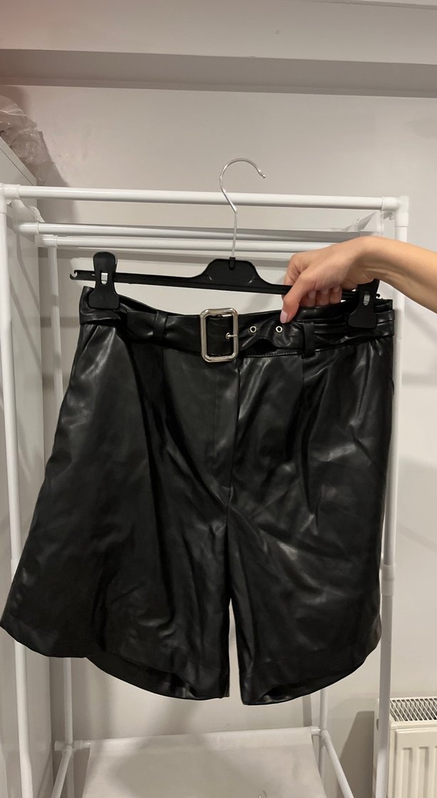 Kemerli, siyah deri mini şort. Sokak stili için uygun, günlük kullanımda tercih edilebilir, desen içermeyen koyu renkli model.