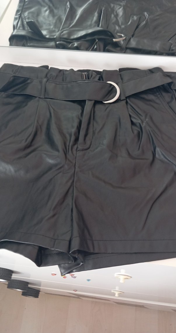 Kemerli, siyah deri mini şort, sokak stili ve açık hava kullanımı için uygun, trend casual görünüme sahiptir. Desensiz ve dar kesimdir.