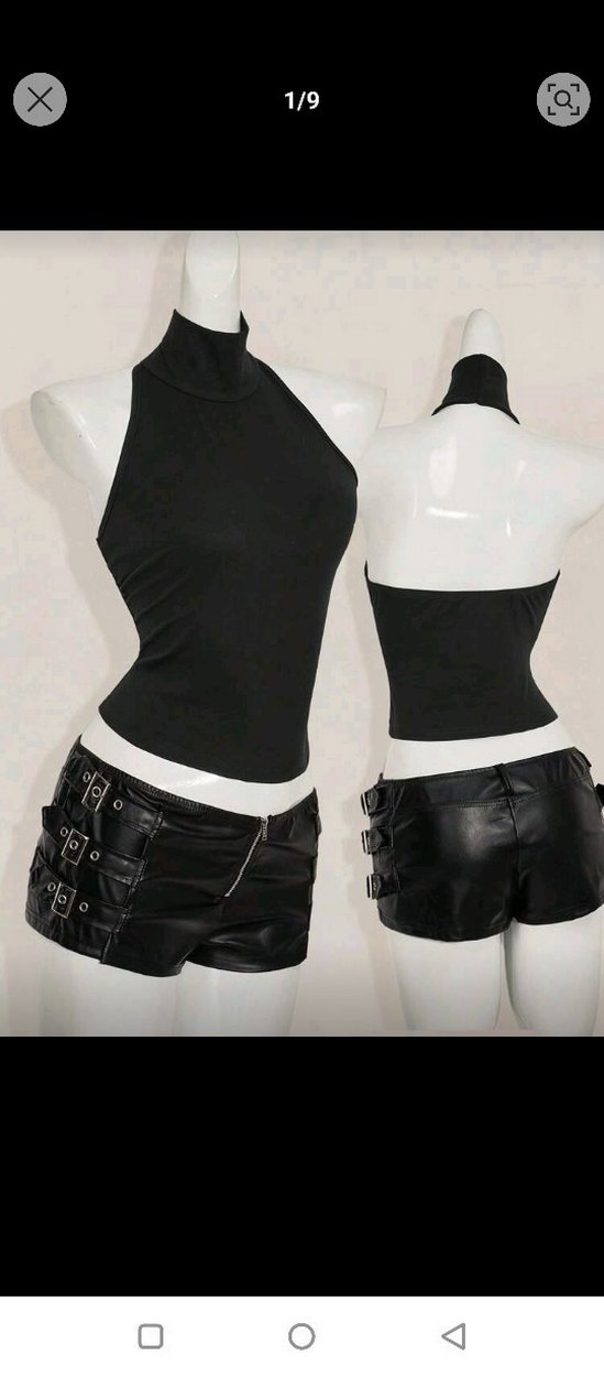 Kemerli ve yanlarda çoklu tokalar bulunan siyah deri mini şort, cesur gotik parti tarzı için uygundur.