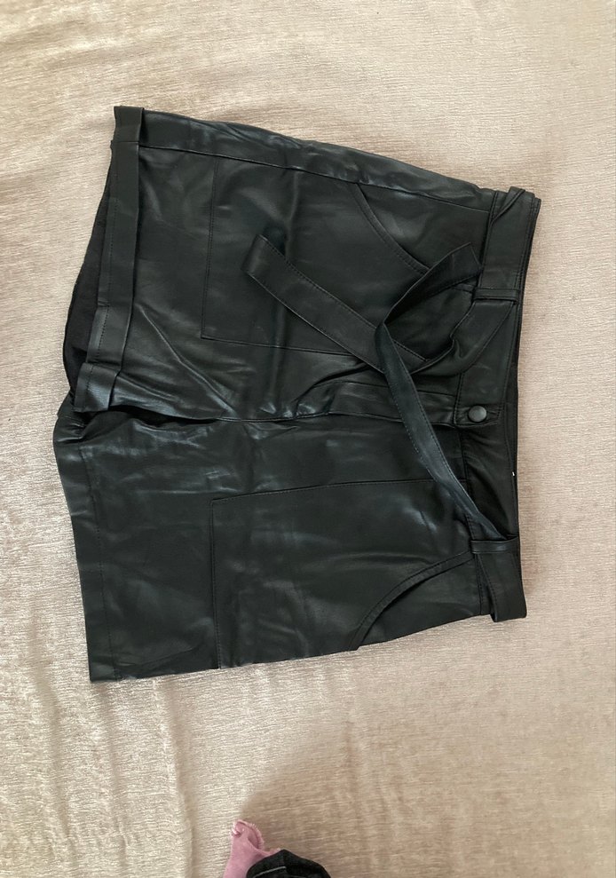 Koton kids bölümünden almışım fakat s beden giyiyorum tam oluyor az giyilmiştir.Kemerli ve dar kesimli siyah deri mini şort, sokak stili için uygun ve dış mekan kullanımı için ideal.