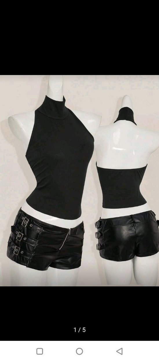 Siyah, kemerli ve yanlarda çoklu tokalı, fit kesim deri mini şort. Cesur, gotik parti tarzları için uygundur...koton temsili