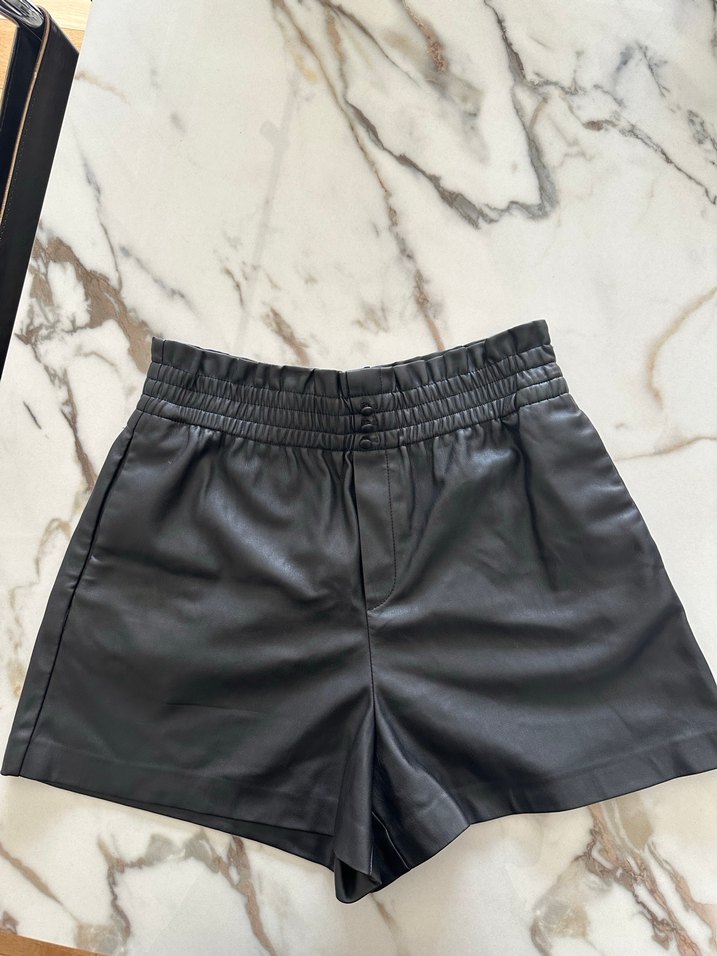 Kemerli bel ve bol kesim ile siyah deri mini şort, günlük ve sokak tarzı için uygundur.