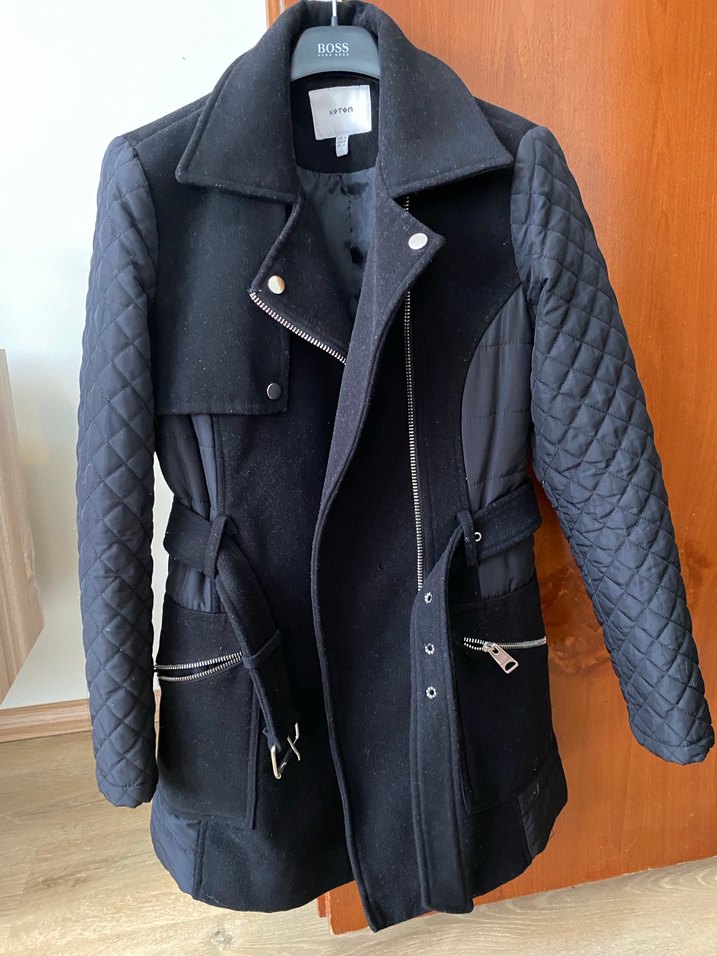 Kemerli bel, kapitone deri kollara ve notched yakaya sahip siyah motosiklet ceketi. Normal kesim ve midi boyda, günlük kullanıma uygun.