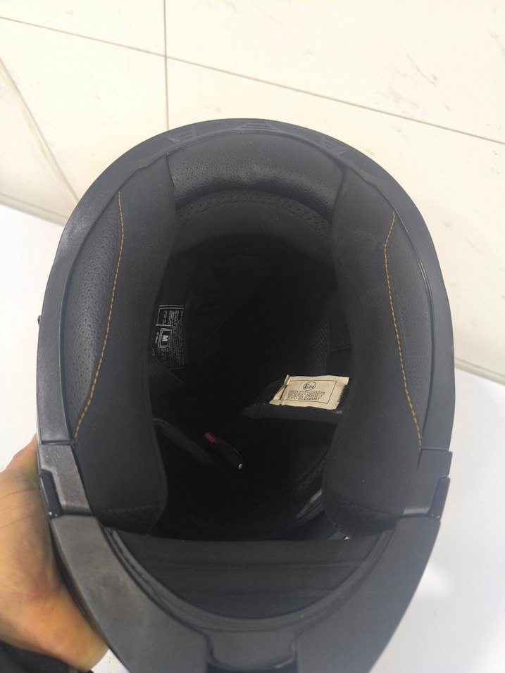 Kemerli tasarıma sahip siyah deri motosiklet kaskı, sıfır ayarında bir haftalık kask