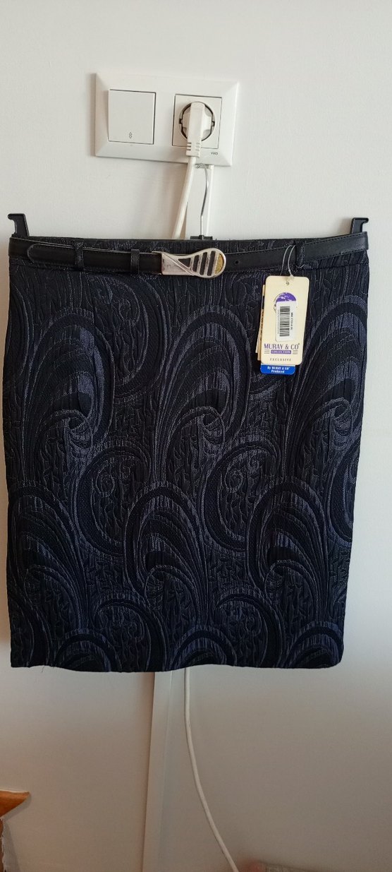 Sentetik kumaştan yapılmış, kemerli ve desenli siyah kalem etek. Midi boyda, ofis kullanımı için uygun, gotik tarzda ve vücuda oturan kesime sahip.