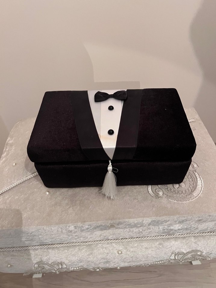 Kemerli siyah damatlık, klasik goth tarzında, düz kesim ve notched yaka ile tasarlanmıştır. Uzun boy ve askılı kollar düğünler için uygundur.