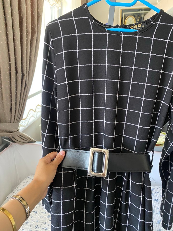 Kemerli Siyah Ekose Midi Elbise
