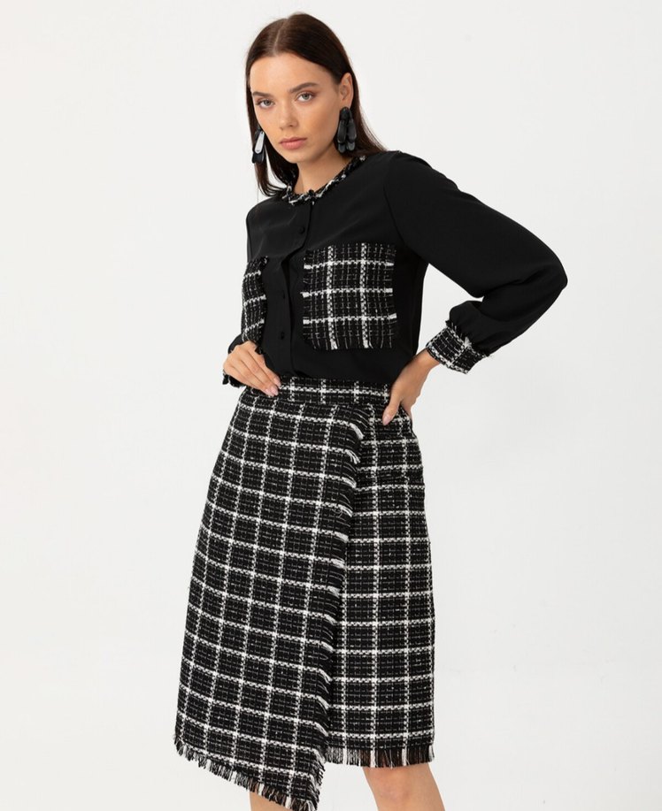 Kemerli Siyah Ekose Midi Kadın Etek