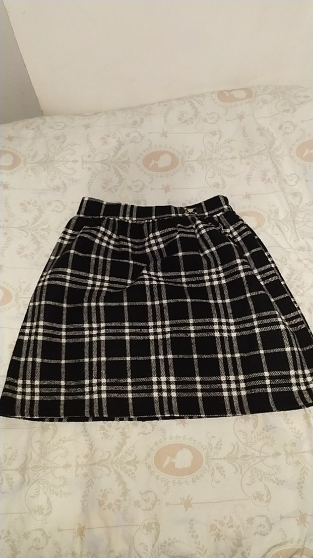 Siyah ekoseli midi etek, bol kesim ve yumuşak, sıcak kumaştan yapılmıştır. Ayarlanabilir kemer içerir, günlük kullanım için uygundur.