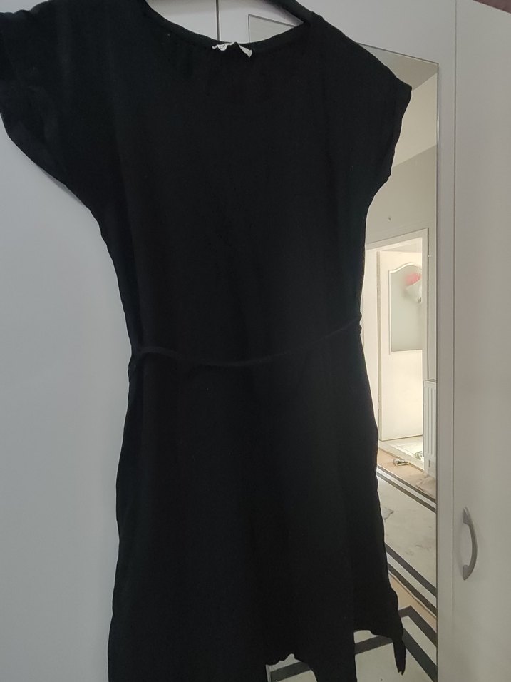 Kemerli bel, kısa kollu ve bisiklet yaka detaylı siyah elbise. sentetik kumaştan üretilmiş günlük kullanıma uygun.