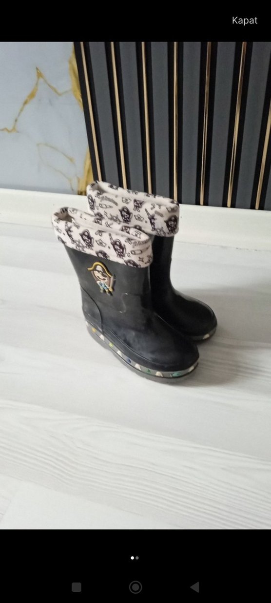 Kemer detaylı siyah kauçuk erkek çizmesi, gri desenli iç astar ile. Gotik tarzda, dayanıklı tabanlı ve desenli detaylara sahip.