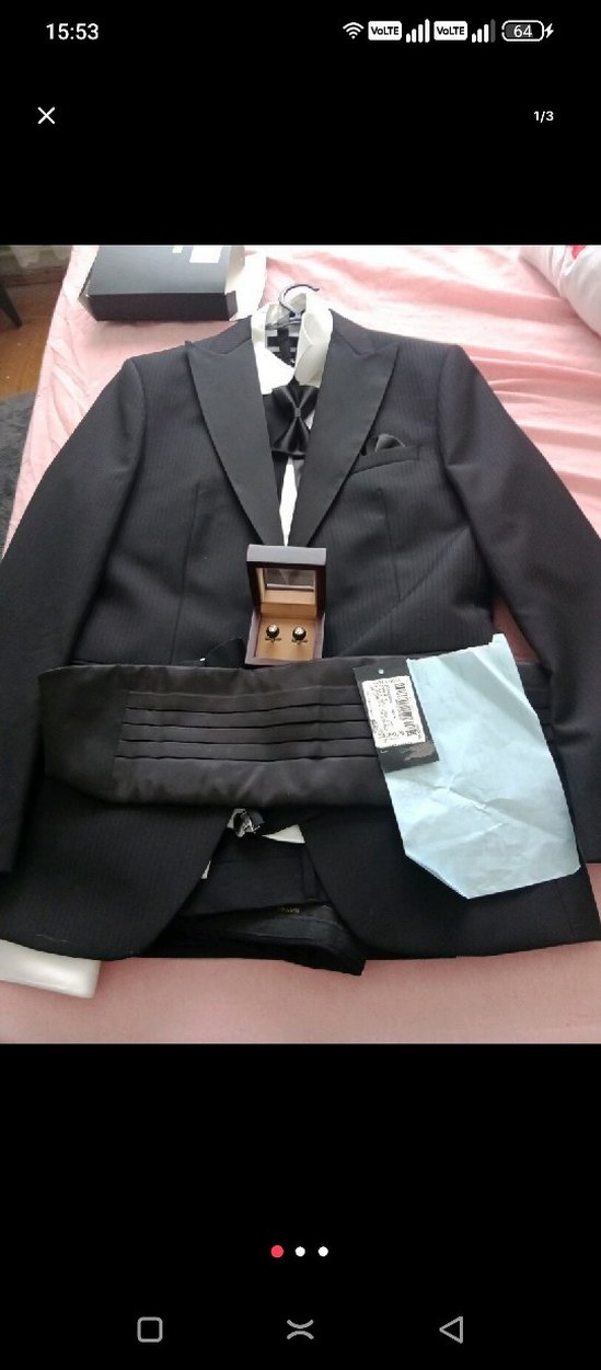 Kemerli, kesik yaka ve normal kesim siyah erkek takım elbisesi. Ofis için klasik ve şık tarzda, askılı kollu.
