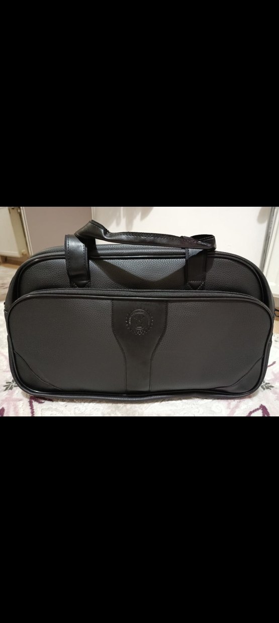 Kemerli siyah erkek valiz, klasik ve geleneksel tasarıma sahip, iş kullanımı için uygun, desen içermeyen yüzey ve sağlam saplarla donatılmıştır.