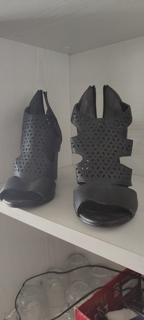 Kemer detaylı, desenli siyah dolgu topuklu ayakkabılar, kauçuk malzemeden yapılmıştır. Gotik tarzda romantik akşamlar için uygundur.