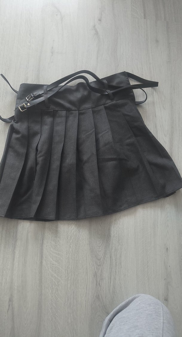 Kemerli, pilili ve siyah renkte gotik tarzda, vücuda oturan mini etek. Sentetik kumaştan üretilmiştir.