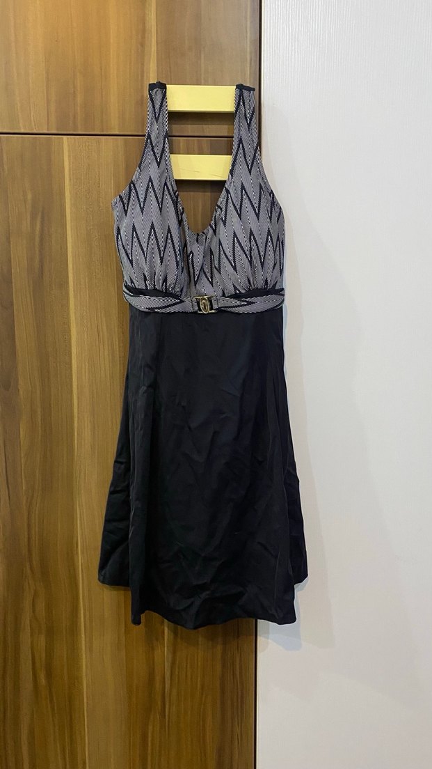 Kemerli, zebralı desenli üst kısmı ve siyah midi boyu ile fitted kesim kadın mayo, cesur goth stilini yansıtıyor. toka kismindaki detayda hafif soyulmalar var