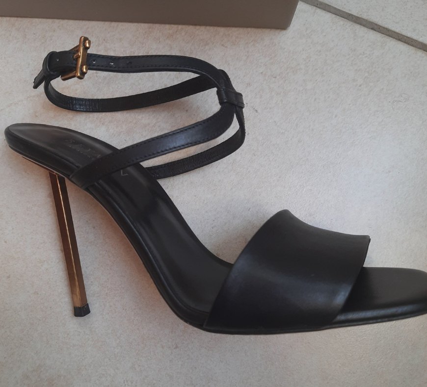 Siyah deri kemerli ince topuklu kadın ayakkabısı, romantik buluşmalar için klasik ve modern tasarım. 1 defa kullanıldı.