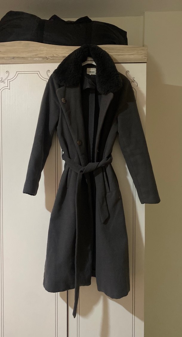 Kemerli ve yumuşak kürk yakalı siyah uzun kaban, soğuk günler için sıcaklık ve şıklık sağlar.