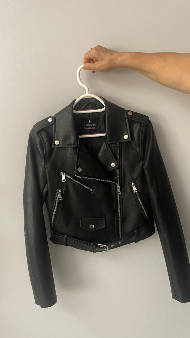 Kol ve Yaka da aşınma olmuştur. Fotoğrafta belirtildi. Kemerli, kesimli, siyah biker tarzı deri ceket. Notlu yakalı ve kayış detaylı, rock punk havası verir.