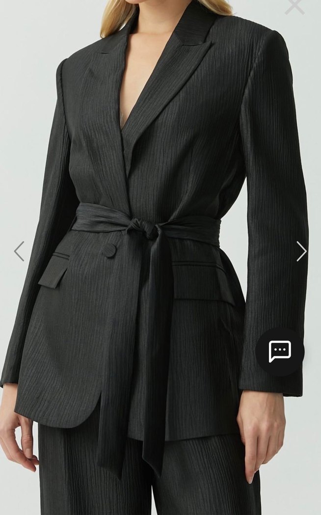 Ürün hiç giyilmedi, etiketli. Tadilatı yok. 36 bedendir. Pantolonu ile takım olarak satın alabilirsiniz. Kemerli siyah kadın blazer ceket, klasik şıklık için kesik yakalı ve kemerli. Normal kesim, ince sentetik kumaştan, ofis kullanımı için uygun.