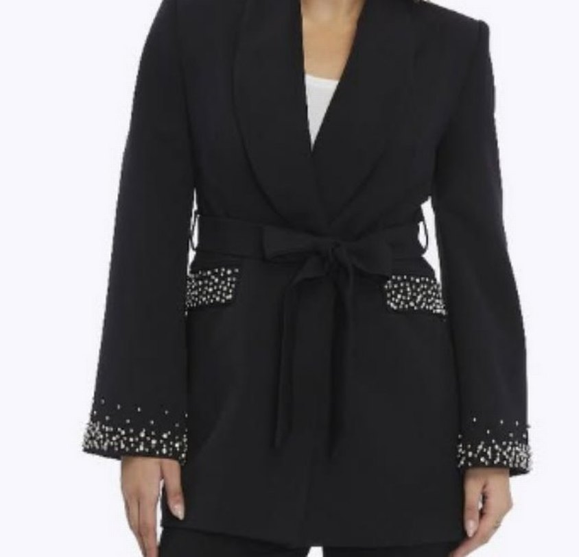 Siyah kadın blazer, kesikli yaka ve uzun kollu. Belde kemerli, manşet ve ceplerde hafif süslemeler bulunur. Ofis için uygun.
