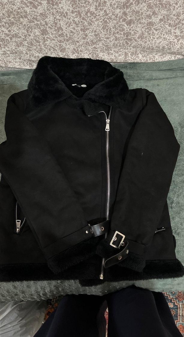 Siyah, kemerli ve kesimli kadına özel ceket. Yumuşak ve sıcak kumaştan, asimetrik fermuar ve kayışlı kollarla sokak stiline uygun midi boy.