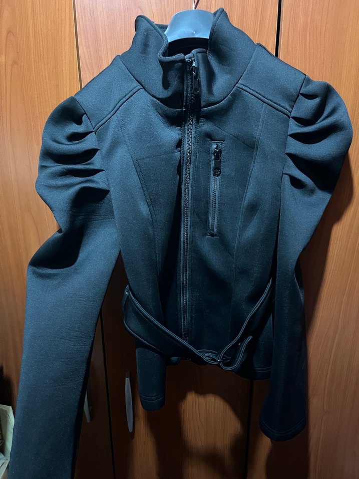 Kemerli, yüksek yakalı ve uzun kollu siyah kadın ceket. Göğüste fermuarlı cep ve sıcak, yumuşak kumaştan üretilmiştir. Günlük kullanım için uygundur.