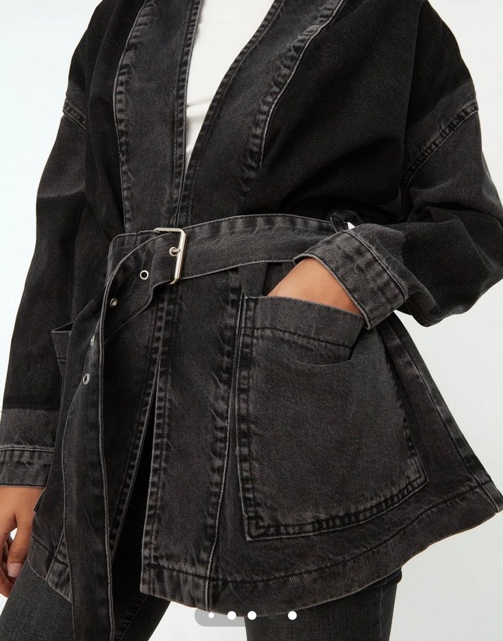 Kemerli, notched lapel yakalı, bol kesim siyah denim ceket. Strappy kollu ve büyük cepli, günlük sokak stili için uygun. Kolda bir çıtçıt koptu ama belli olmuyor kullanımda sıkıntı yaşatmıyor