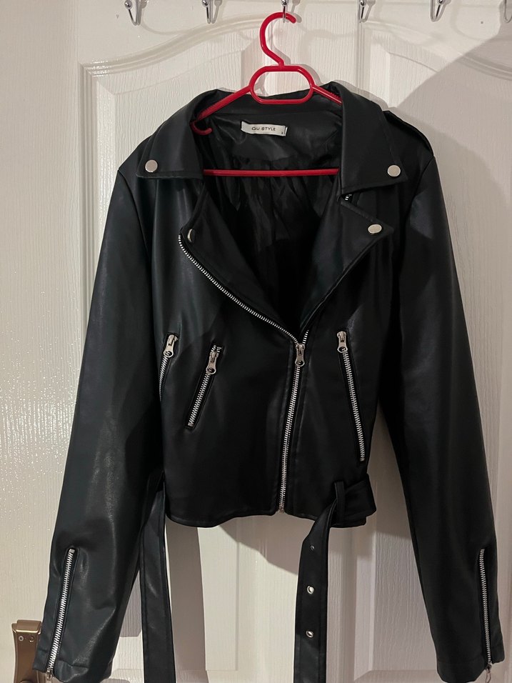 Kemerli, kısa kesim, siyah deri biker ceket. Çıtçıtlı yaka, kayışlı kollar ve fermuarlı detaylara sahip, rock punk tarzını yansıtır.