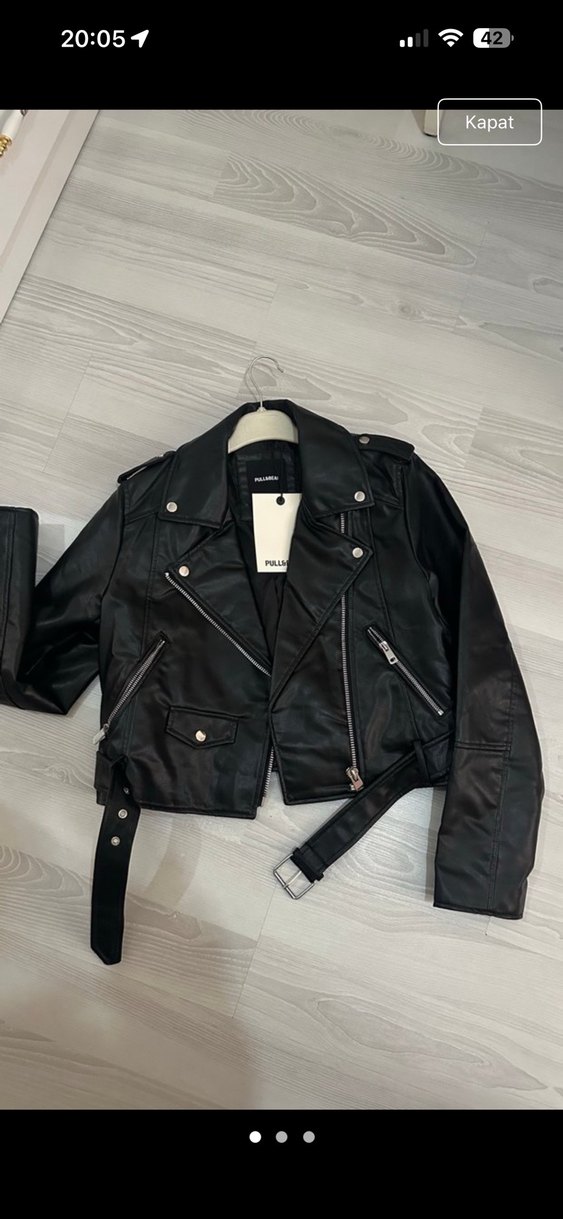 Kemerli, kısa boylu siyah deri biker ceket, keskin yakası ve askılı kollarıyla rock punk havası sunar. Sokak stiline uygun, vücuda oturan tasarım. Hiç giymedim hediye geldi hiçbir sorunu yoktur etiketli