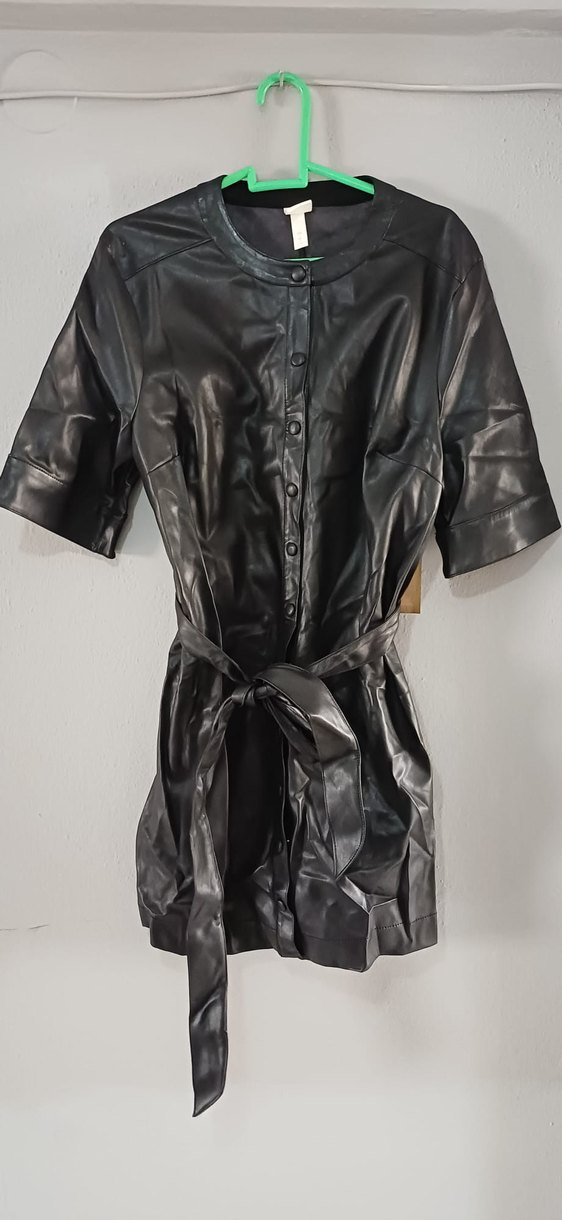 Dar kesim siyah deri ceket, kısa kollu ve kemerli tasarımıyla gotik tarzı yansıtır. Mini boy ve yakası notched lapel şeklindedir.