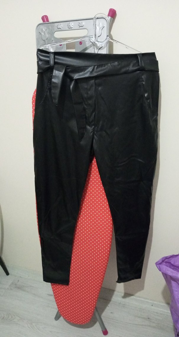 Kemerli, siyah deri pantolon, sokak stili için uygun, sentetik materyalden, dar kesim.