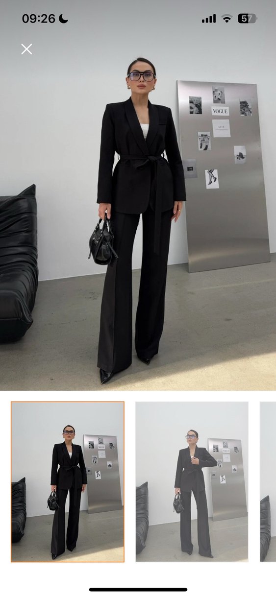Bu siyah kadın iş takımı, kemerli ve kesik yakalıdır. Askılı kollu, regular fit ve midi boydadır. Ofis için uygun, trend sokak stilini yansıtır.