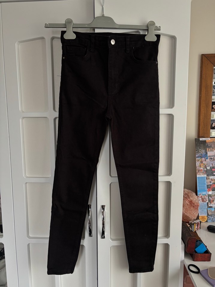 Kemerli, siyah denim kumaştan, normal boyda ve midi uzunlukta, desen içermeyen, sokak tarzına uygun dar kesim kadın jean pantolon.
