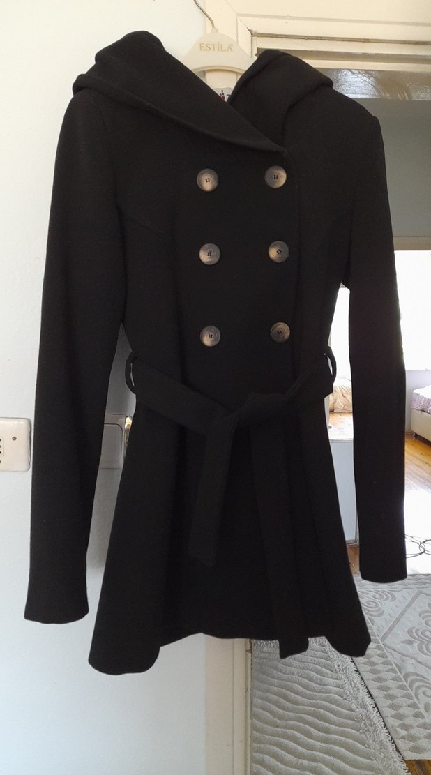Kemerli, çift düğmeli siyah kadın kaban, şık ve klasik bir görünüm sunar. Hiç bir sorunu yok sadece bir kaç kez giyildi.