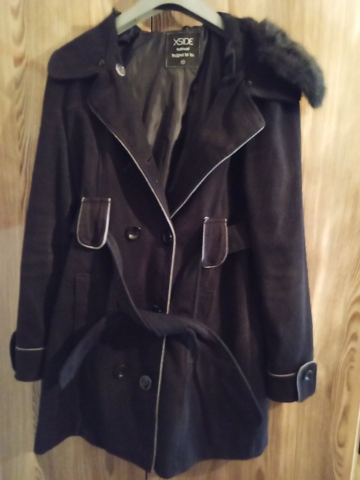 Kemerli, çift düğmeli siyah kadın kaban. Kürk yakalı, cepli ve düğmeli manşet detaylarına sahiptir.