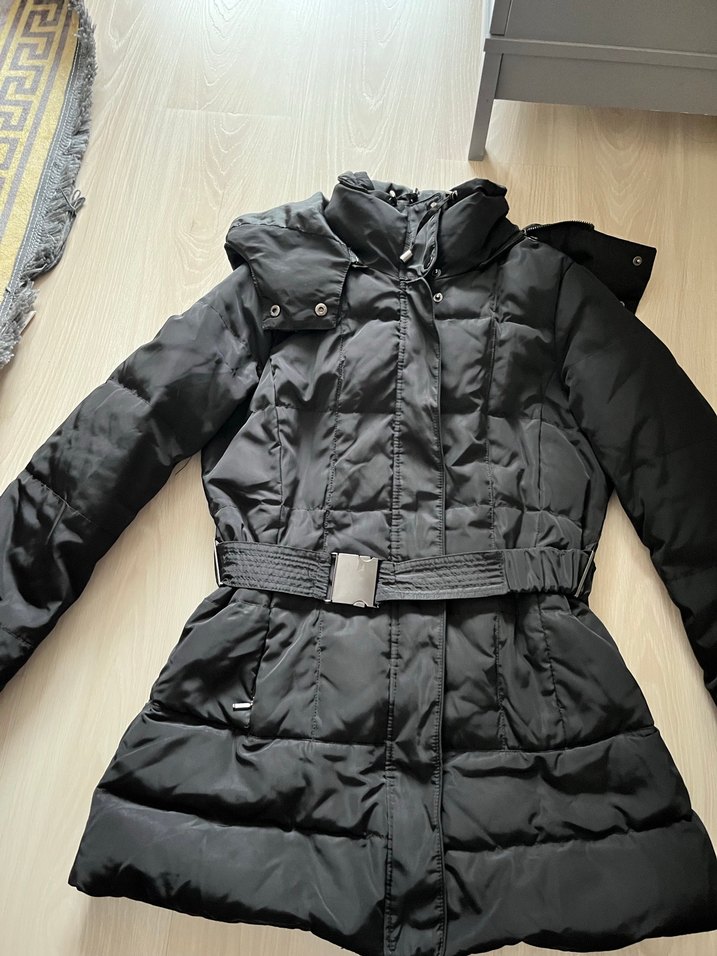 Kemerli bel, çıtçıtlı yakalı ve strapy kollu siyah, normal midi uzunlukta, sentetik kumaştan kadın kışlık mont. Trendy ve rahat dış mekan kullanımı için uygundur. ❄️