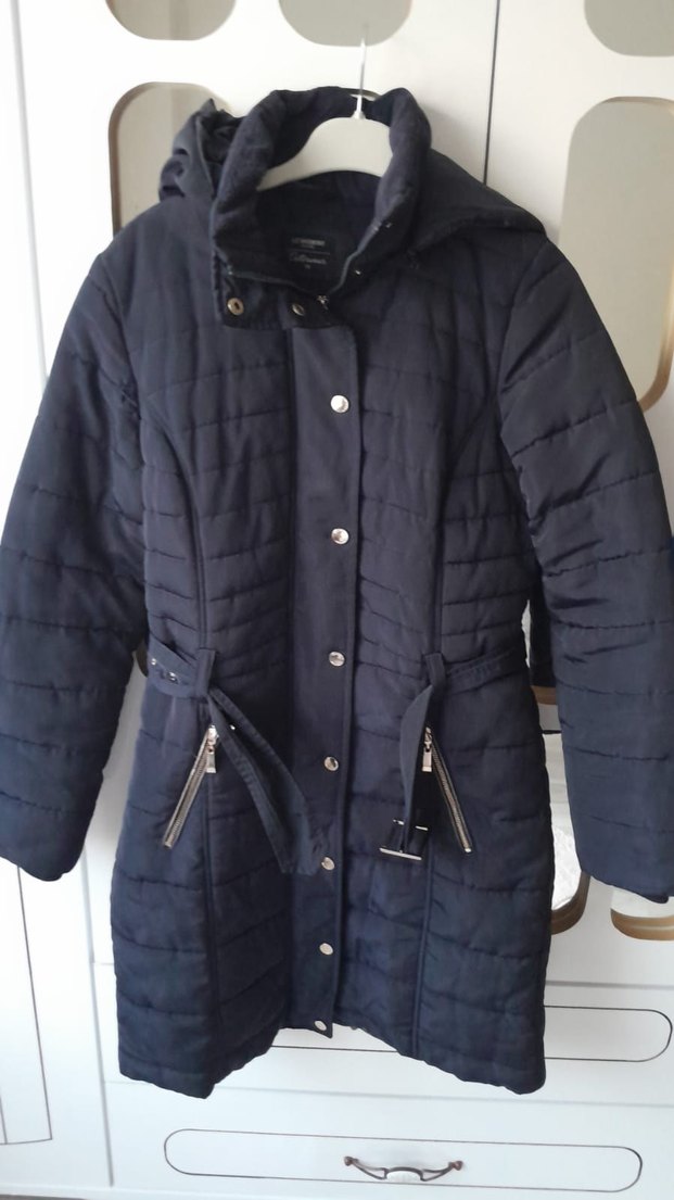 Kemerli ve kesimli siyah kadın kışlık mont, notched yaka ve fermuarlı ceplerle rahat ve şık. Midi boyda, yumuşak ve sıcak kumaşlıdır. İşareti bölümde yırtık var fiyattan düşüyorum tamir olur.