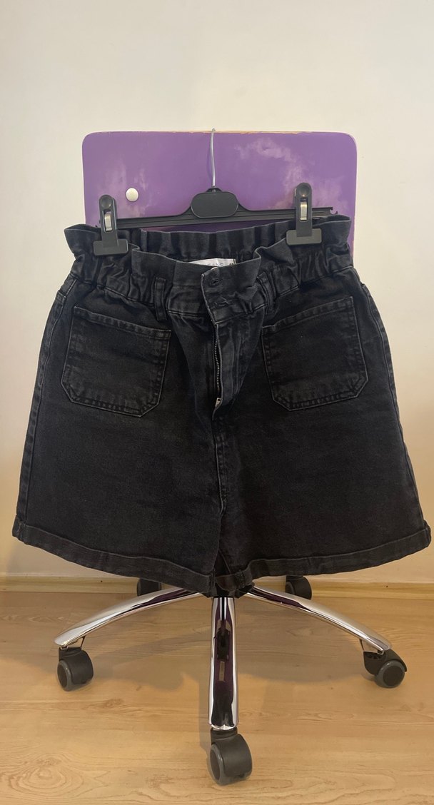 Kemerli bel kısmı ve bol kesimiyle siyah kot şort, günlük kullanıma uygun rahat ve şık bir sokak stili sunar. Mini boy ve ön cep detaylıdır.